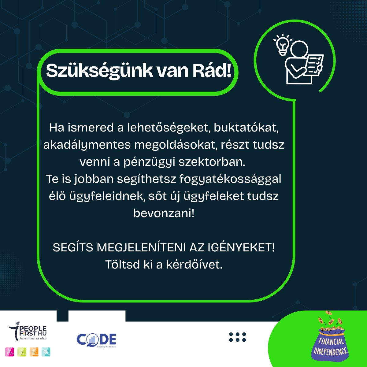 👉 TÖLTSD KI KÉRÜNK a fogyatékossággal élők foglalkoztatási nehézségeiről szóló KÉRDŐÍVET. Ezzel cégeknek, vállalkozásoknak tudunk majd segíteni, munkahelyi inklúzió fejlesztésében.